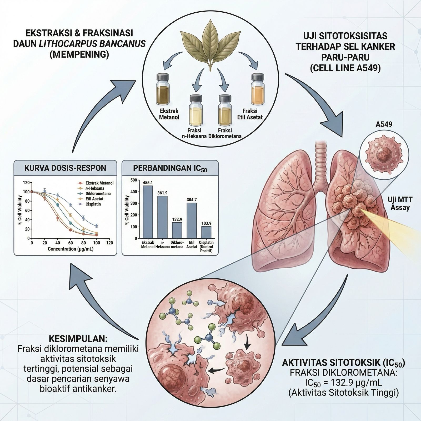 Lithocarpus bancanus is a medicinal plant used by communities in Riau Province, Indonesia. This plant is a tree locally known in the province as mempening. In this study, the cytotoxic activity profiles of the methanolic extract, n-hexane fraction, dichloromethane fraction, and ethyl acetate fraction from L. bancanus leaves were evaluated against human lung cancer cells (A549 cell line) using the MTT assay. IC₅₀ values were calculated from dose–response curves analyzed using the 4-parameter logistic (4PL) model. The results showed IC₅₀ values of 455.1, 361.9, 132.9, and 304.7 µg/mL for the methanolic extract, n-hexane fraction, dichloromethane fraction, and ethyl acetate fraction, respectively, with the dichloromethane fraction exhibiting relatively higher cytotoxic activity (IC₅₀ = 132.9 µg/mL). Cisplatin was used as the positive control and showed an IC₅₀ of 103.9 µg/mL. Meanwhile, the methanolic extract as well as the n-hexane and ethyl acetate fractions showed low cytotoxic activity, with IC₅₀ values greater than 300 µg/mL. Therefore, the dichloromethane fraction can serve as a basis for further isolation to identify bioactive anticancer compounds.