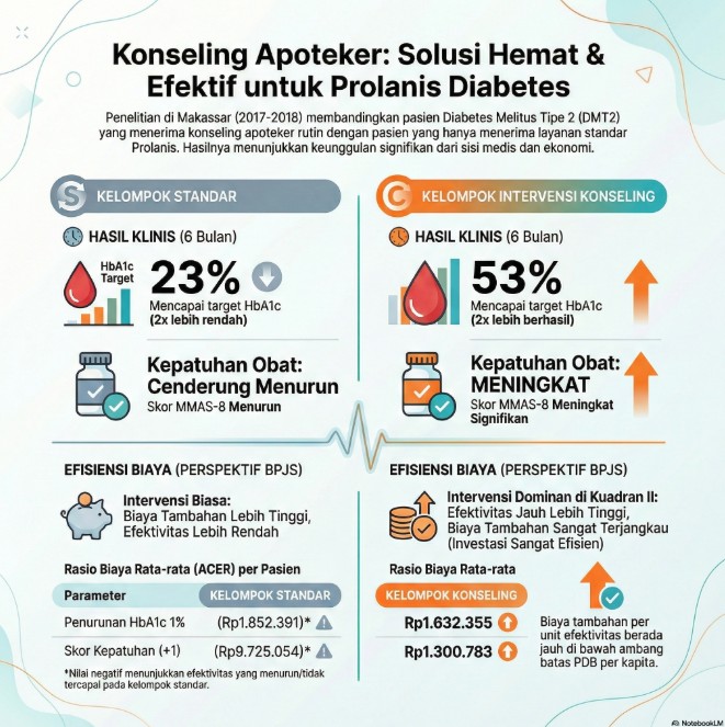 Type 2 Diabetes Mellitus (T2DM) imposes a substantial economic burden on healthcare systems. Evidence indicates that pharmacist involvement in medication management can improve glycemic control, adherence, quality of life, and reduce drug-related problems. However, the cost-effectiveness of pharmacist participation within the Prolanis program remains unclear. This study aimed to evaluate the cost-effectiveness of pharmacist counseling in managing T2DM under the Prolanis scheme compared with standard care. A cluster randomized clinical trial was conducted from 2017 to 2018 across four primary health centers in Makassar City. Eligible patients were allocated to an intervention group receiving structured pharmacist counseling or a control group receiving standard Prolanis services. Economic evaluation was performed from the payer and healthcare provider perspectives. A total of 220 patients met the inclusion criteria (109 intervention, 111 control). In the control group, the Average Cost-Effectiveness Ratio (ACER) based on direct medical costs was IDR –1.852.391,24 per 1% HbA1c reduction and IDR –9.725.054 per 1-point MMAS-8 improvement. Under capitation costs, ACERs were IDR –14.285,71 and IDR –75,000. In the intervention group, ACERs for direct medical costs were IDR 1.632.355,45 per 1% HbA1c reduction and IDR 1.300.783,25 per MMAS-8 point increase; for capitation costs, ACERs were IDR 11.764,71 and IDR 9.375. Cost-effectiveness mapping showed the intervention group in Quadrant II, indicating improved effectiveness with acceptable incremental costs. These findings support the economic value of integrating pharmacist counseling into Prolanis T2DM management.