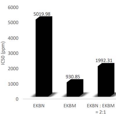 The peel of pineapple (Ananas comosus (L.) Merr.) and mango (Mangifera indica L.) contain polyphenolics that have antioxidant activity and tyrosinase inhibitor. Both of these activities are useful for skin lightening treatments. The purpose of this study was to determine the value of the antioxidant and tyrosinase inhibitor activity of each pineapple peel extract (EKBN) and mango peel extract (EKBM), and their combination with a ratio of 2:1; 1:1; 1:2. The combination that gives the best value for antioxidant activity and tyrosinase inhibitor may be made for cosmetic preparations. The antioxidant activity of each extract and its combination was determined by the DPPH method, after the antioxidant IC50 value was obtained, then the tyrosinase enzyme inhibitory activity was tested. The results showed that EKBN; EKBM; the combination of EKBN and EKBM with a ratio of 2:1, 1:1, 1:2 has antioxidant activity with IC50 values: 618.42 ppm, 10.29 ppm, 30.73 ppm, 20.20 ppm and 18.04 ppm, has tyroinase inhibitory activity with IC50 of 5,019.98 ppm, 930.85 ppm, 1.992.31 ppm, 2.070.89 ppm and 2.839.75 ppm, respectively. There is a correlation between the IC50 of the combined extract and its weight. the combination of EKBN and EKBM, 1:2 gave the best antioxidant activity results with an IC50 value of 18.04 ppm (very strong) and the combination of EKBN and EKBM, 2:1 gave tyrosinase inhibitory activity with an IC50 value of tyrosinase 1.992.31 ppm. The combination of EKBN and EKBM, 1:2 may be developed further as cosmetic preparations such as serum, liquid spray, and others.